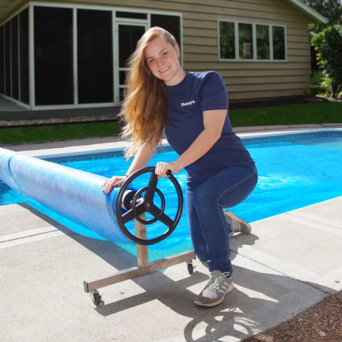 This easy-to-operate solar reel system features a weather-resistant stainless steel rolling base with a large, convenient locking casters. The system’s adjustable-width aluminum roller tubes are designed to keep the solar cover secure by using unique, easy-to-attach elastic straps. When the solar cover is rolled up, removing it from the pool area is a breeze. For removal, simply unlock the heavy-duty casters and roll the whole assembly across your deck or your yard away from your pool to your storage area. Easy installation. Made with non-corrosive materials. 1-year warranty.